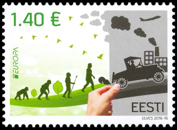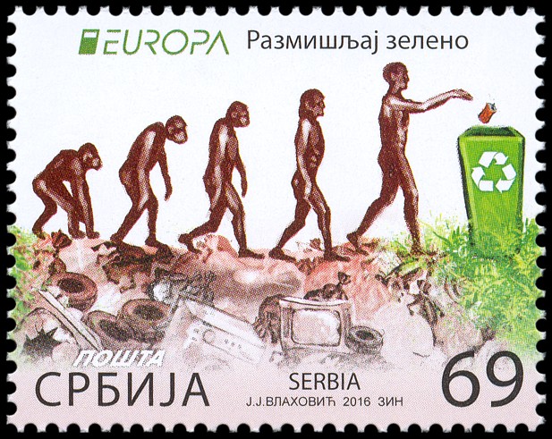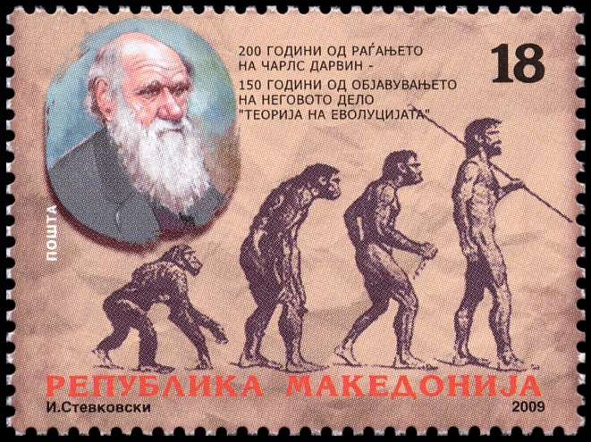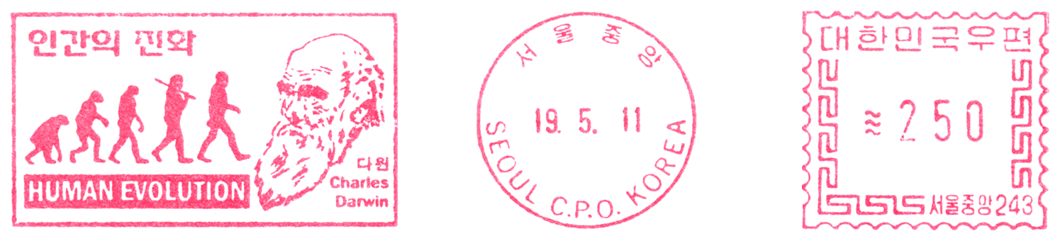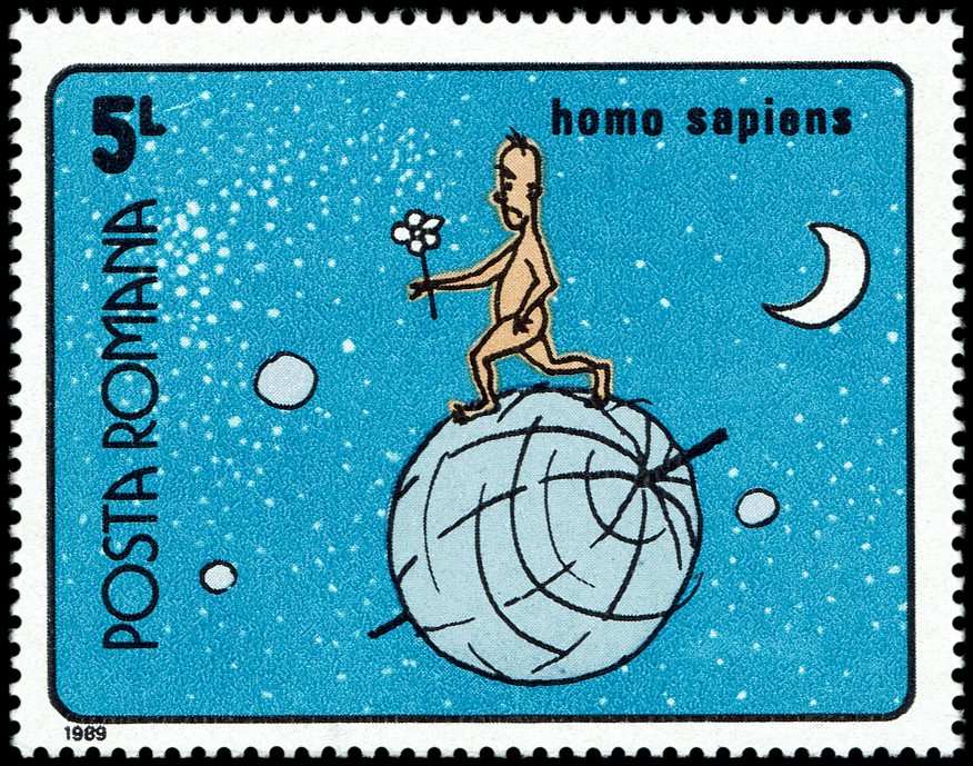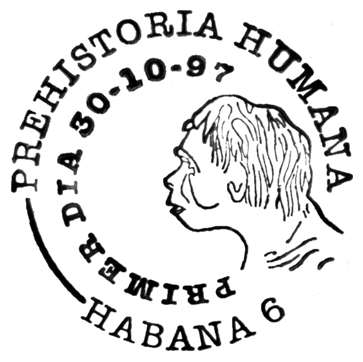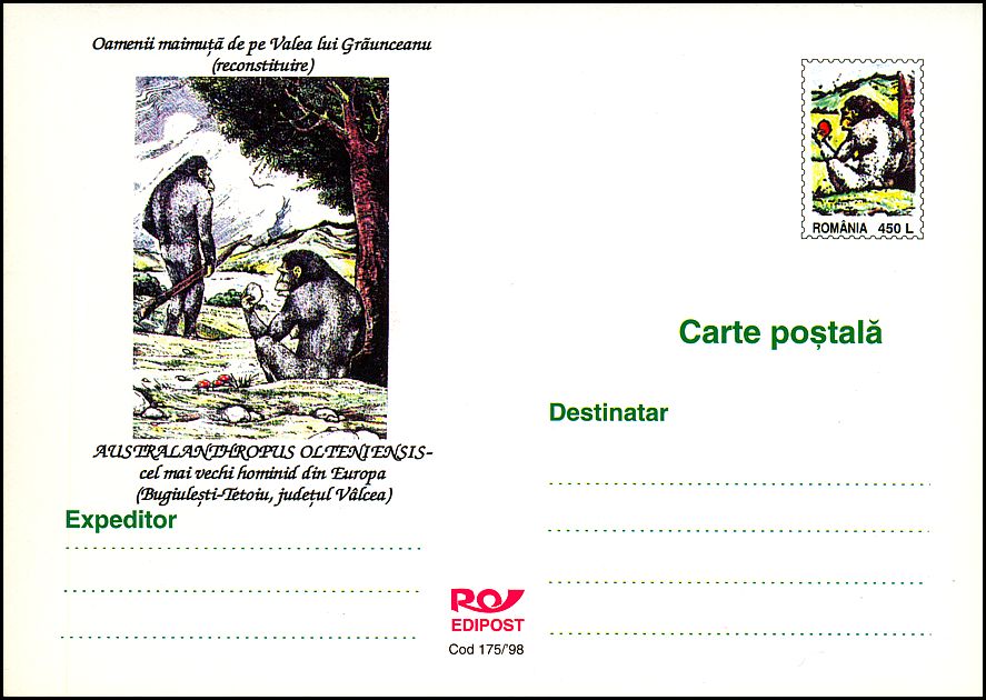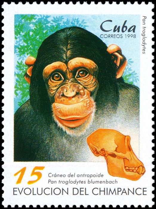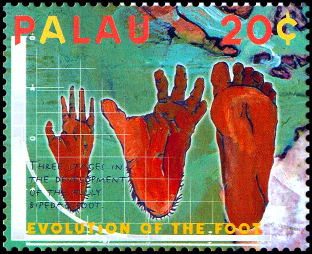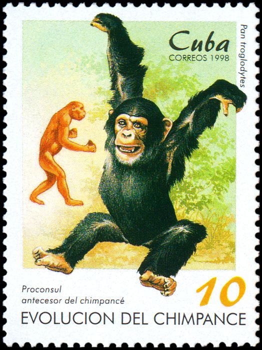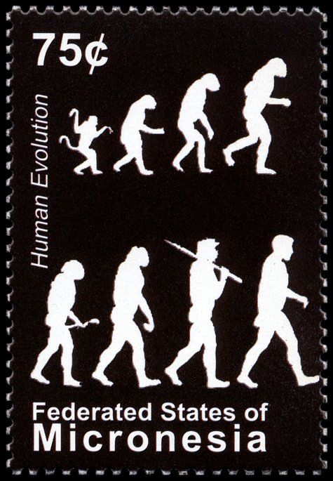 Ewolucja człowieka była i jest przedstawiana często w uproszczonej, a nawet mocno zbarbaryzowanej wersji, w której ogranicza się ją do hasła o pochodzeniu człowieka „od małpy”. Niekiedy ukazuje się ją także (tak jak na tych znaczkach i datownikach) w sposób sugerujący kierunkowość i celowość ewolucji oraz jej liniowy przebieg, podczas gdy w rzeczywistości powstanie