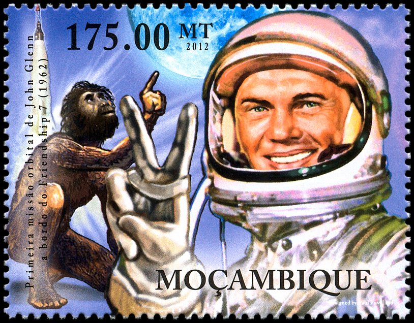 per aspera ad astra, a jednocześnie losów ludzkości — jakiś małpolud przyglądający się księżycowi i John Glenn (ur. 1921), pierwszy astronauta amerykański.