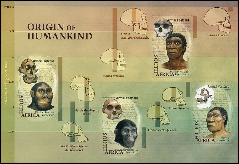Na tym arkusiku znaczków RPA, kraju oficjalnie szczycącego się mianem „kolebki ludzkości”, przedstawiono drzewo genealogiczne człowieka na przestrzeni ostatnich 3 milionów lat, od