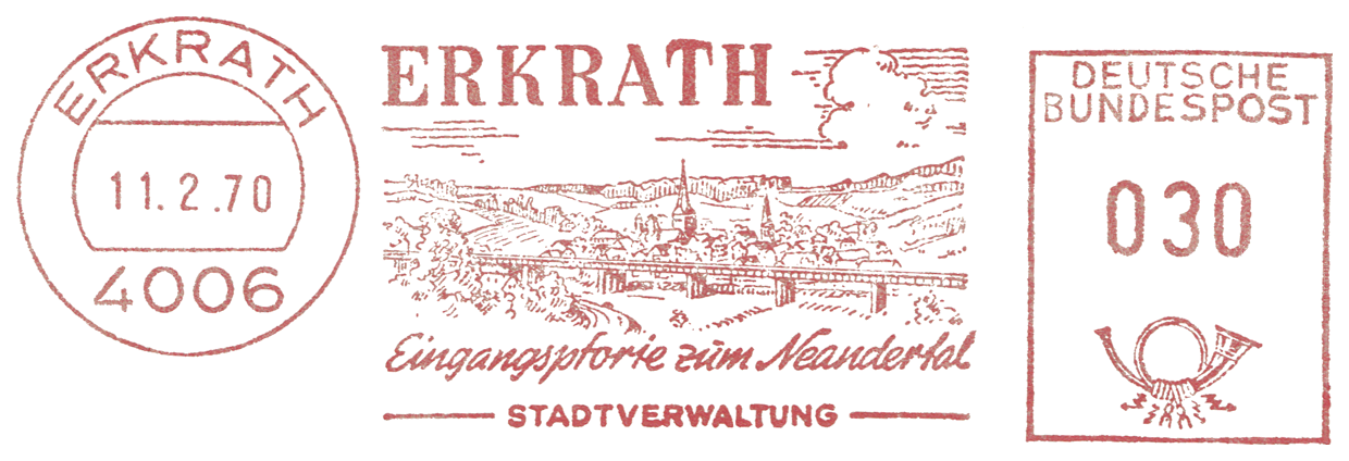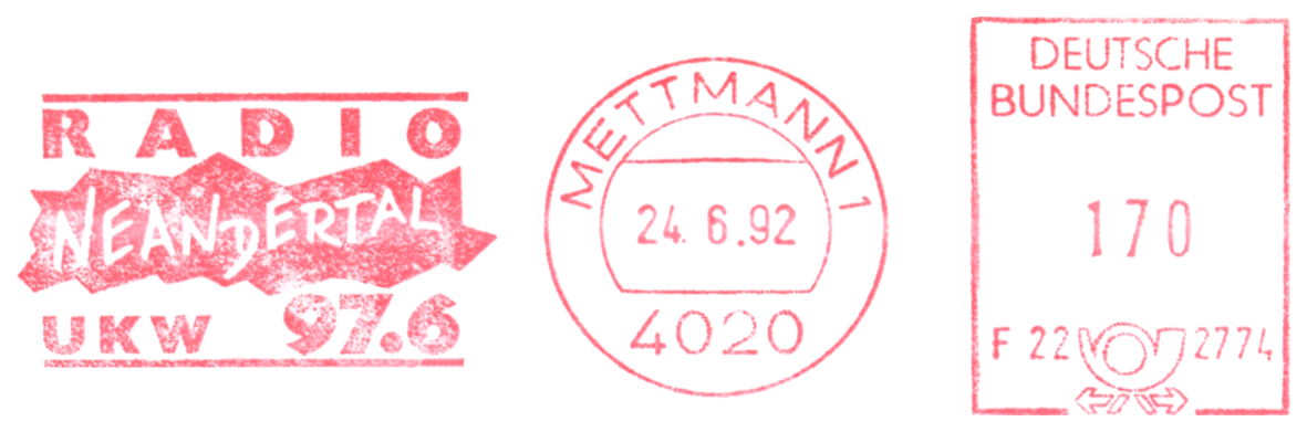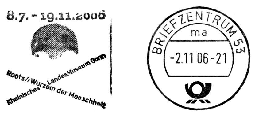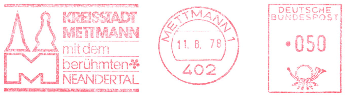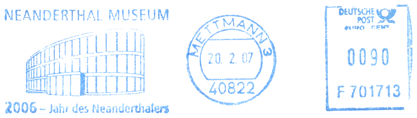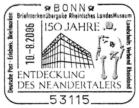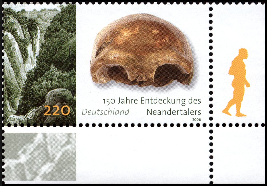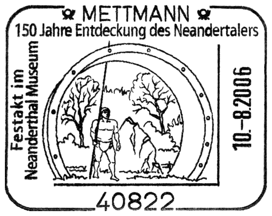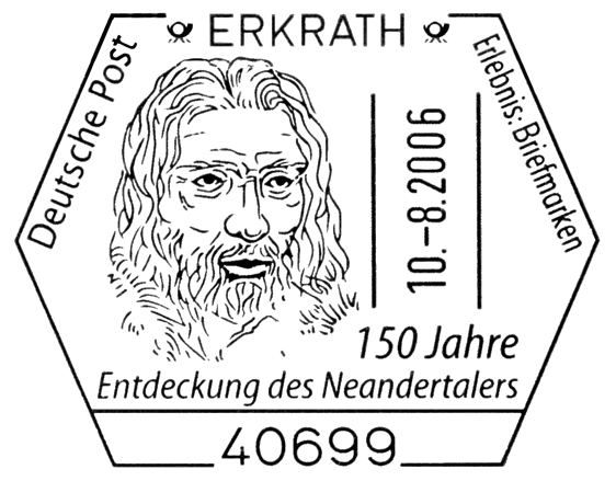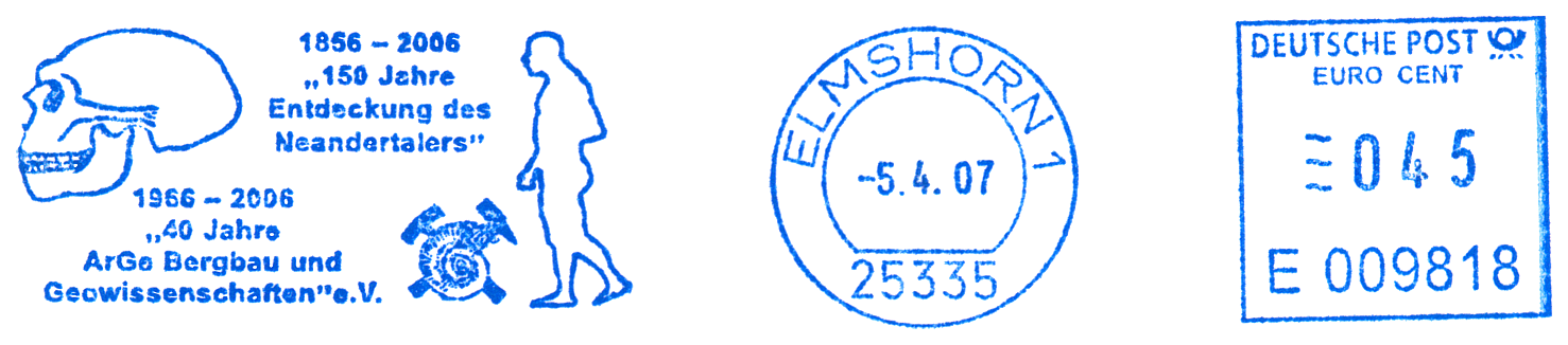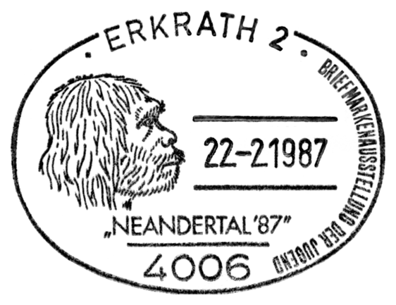 Czaszka i sylwetka neandertalczyka na frankaturze mechanicznej z Elmshorn (Szlezwik-Holsztyn) z nakładką reklamową poświęconą 150. rocznicy słynnego odkrycia w Neandertal oraz 40 rocznicy powstania ArGe (Arbeitsgemeinschaft) Bergbau und Geowissenschaften e.V. (rodzaj klubu zainteresowań tematyką górnictwa, nauk o Ziemi, prahistorią i paleoantropologią w Związku Filatelistów Niemieckich).