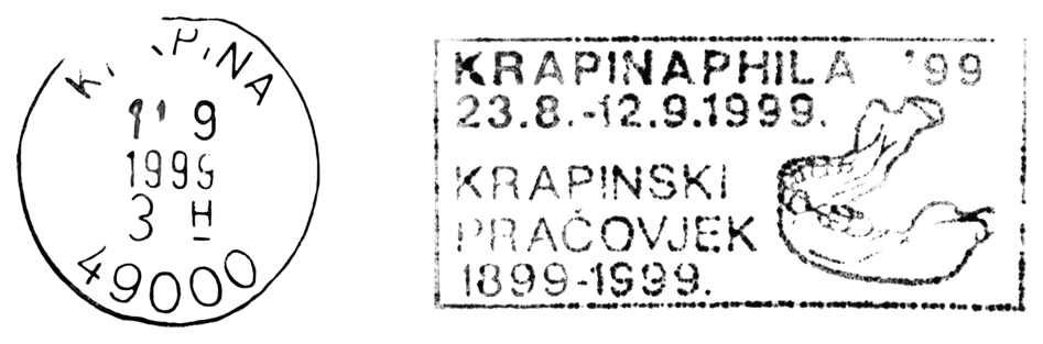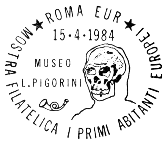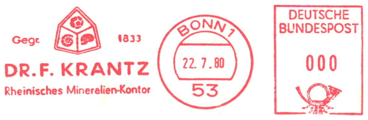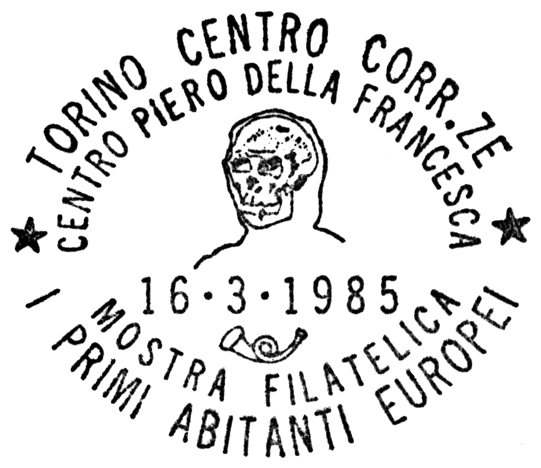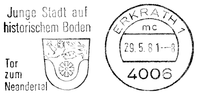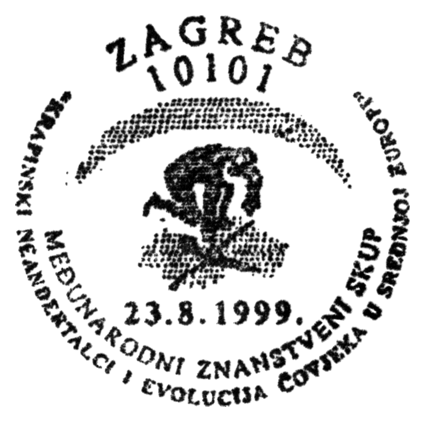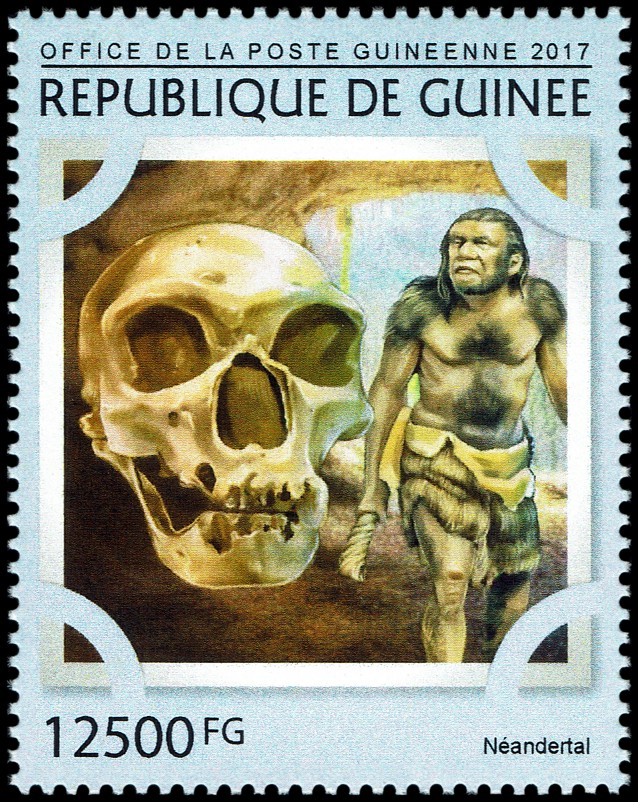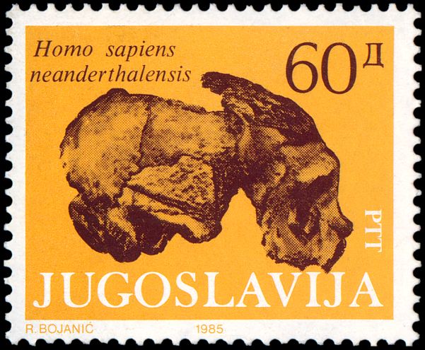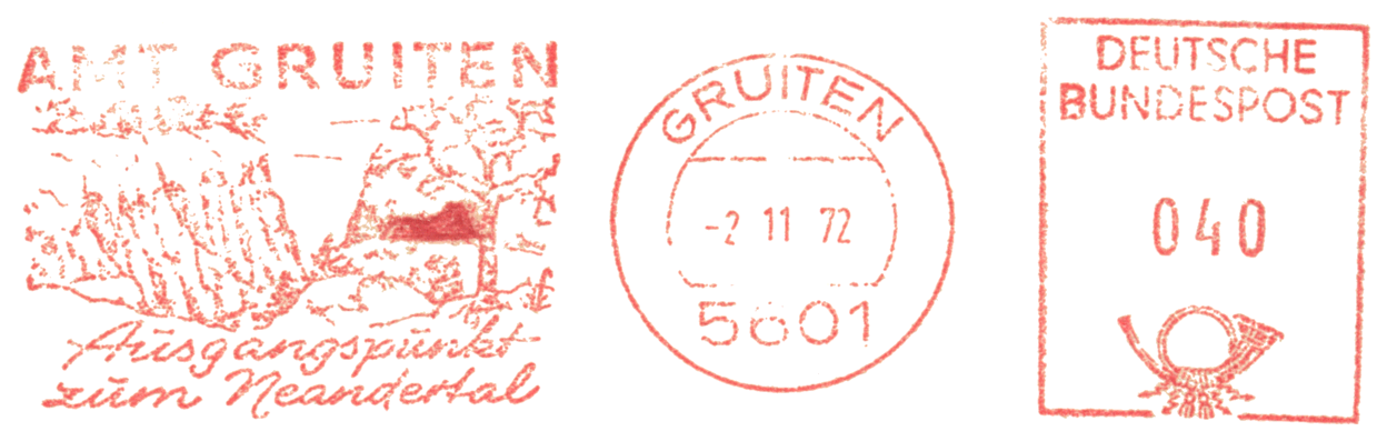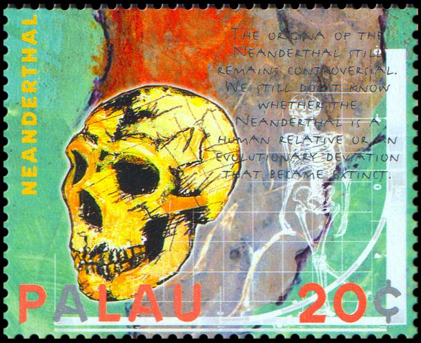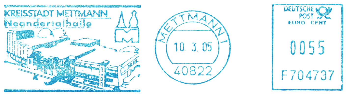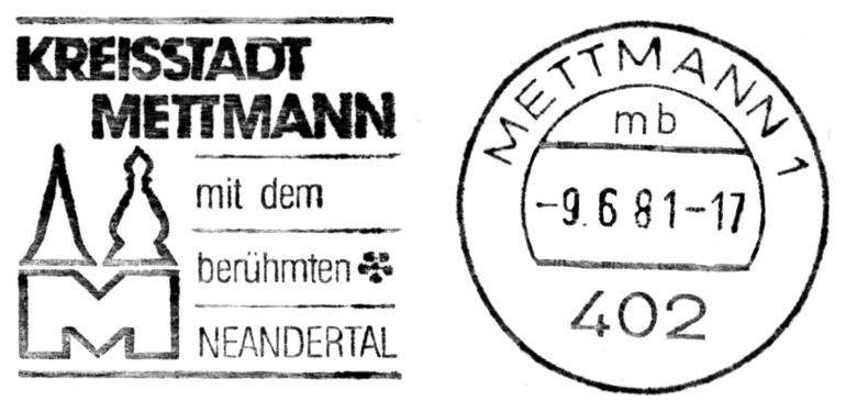 Czaszka i sylwetka neandertalczyka na frankaturze mechanicznej z Elmshorn (Szlezwik-Holsztyn) z nakładką reklamową poświęconą 150. rocznicy słynnego odkrycia w Neandertal oraz 40 rocznicy powstania ArGe (Arbeitsgemeinschaft) Bergbau und Geowissenschaften e.V. (rodzaj klubu zainteresowań tematyką górnictwa, nauk o Ziemi, prahistorią i paleoantropologią w Związku Filatelistów Niemieckich).