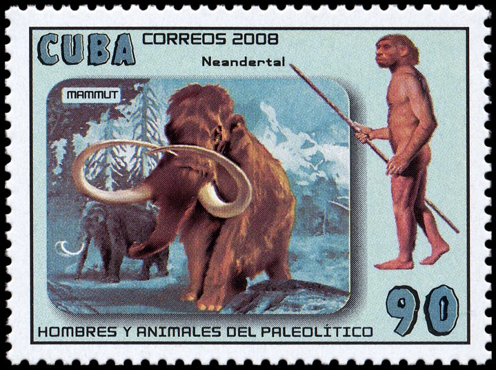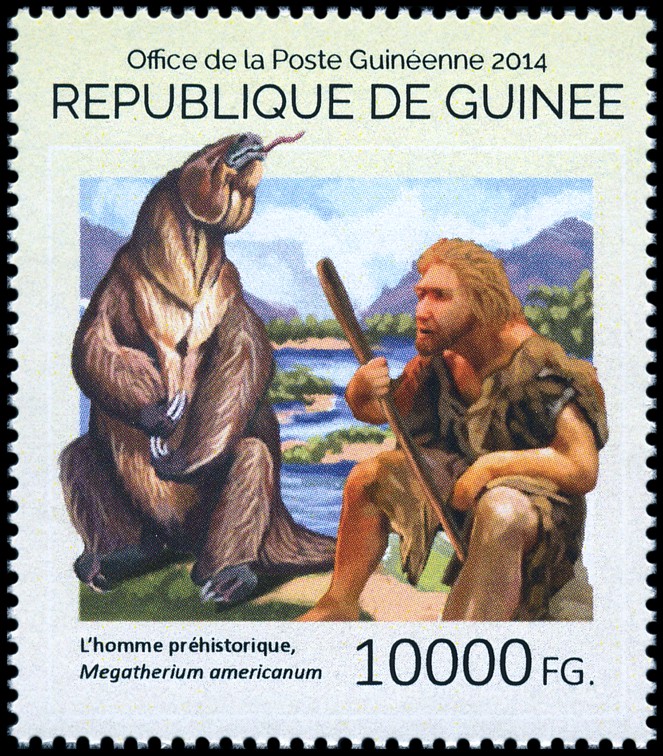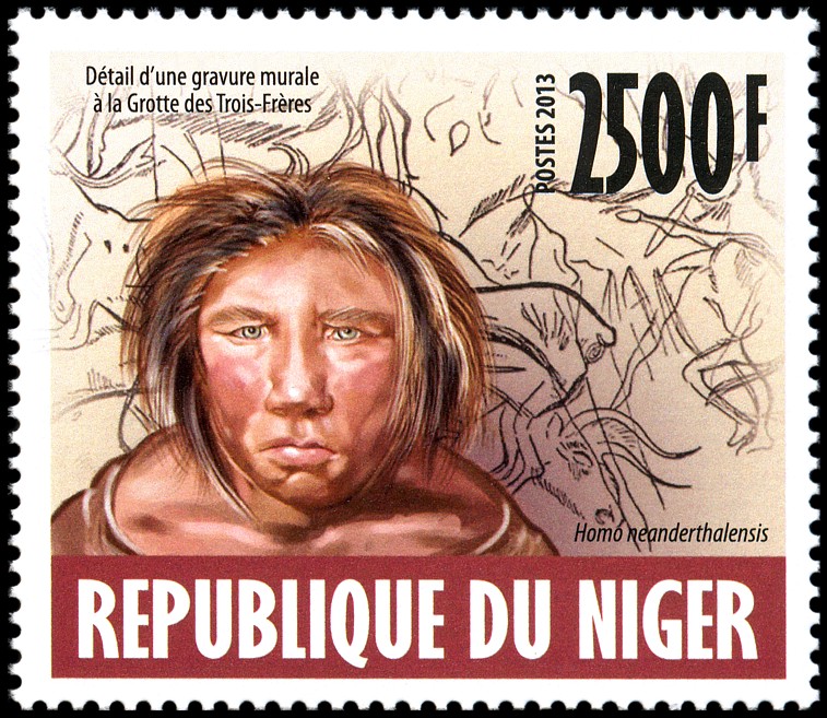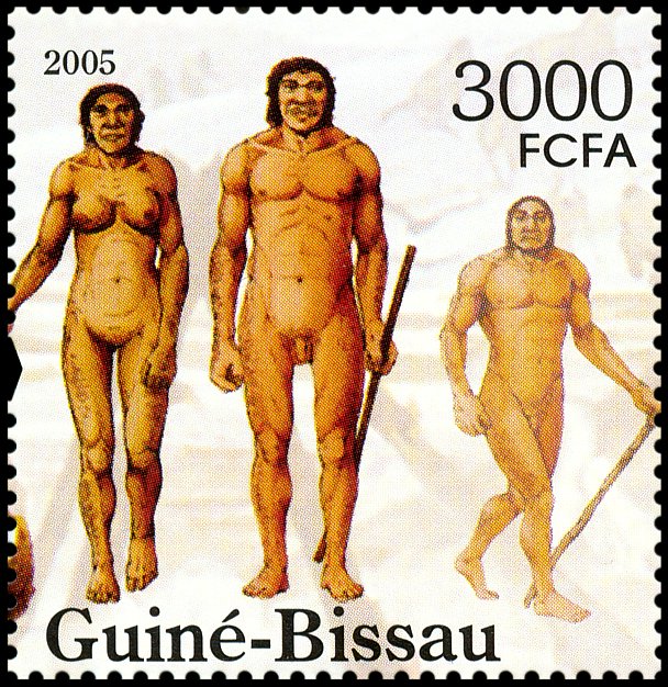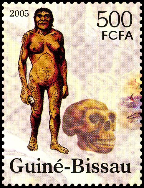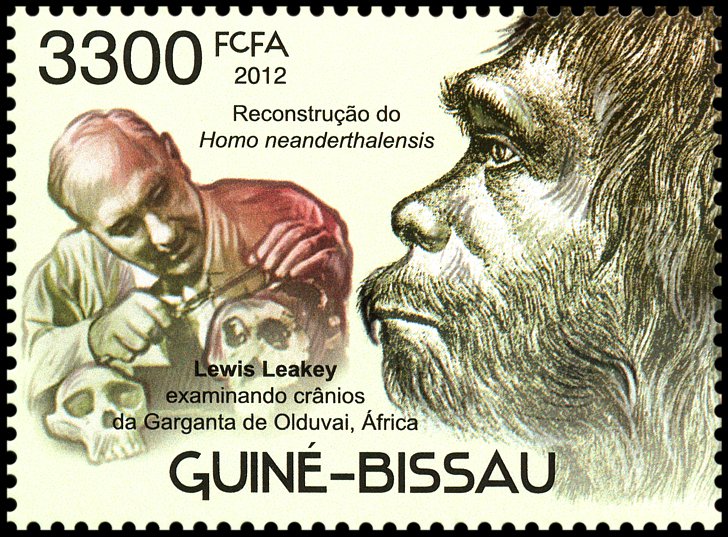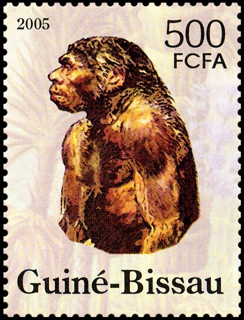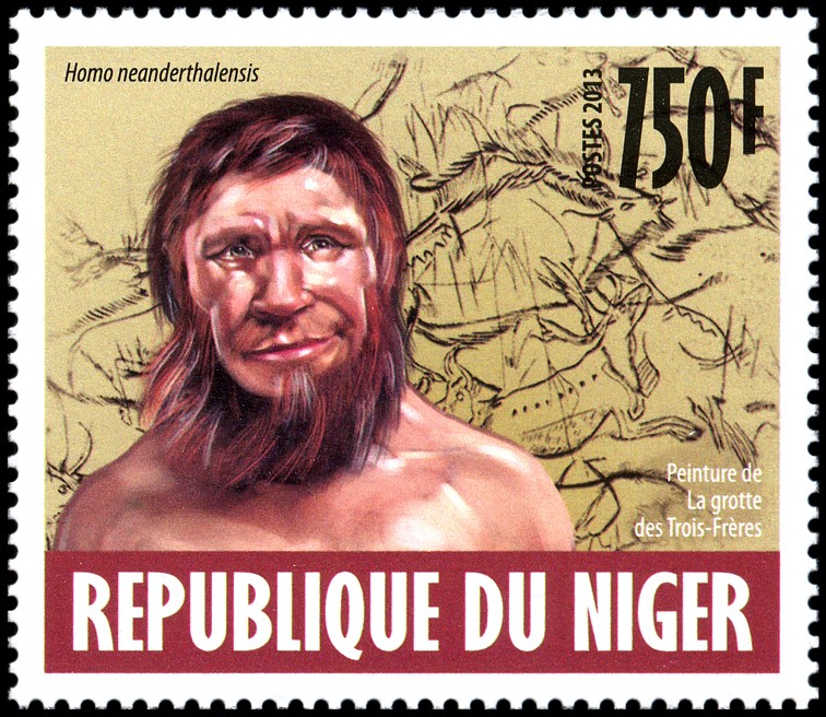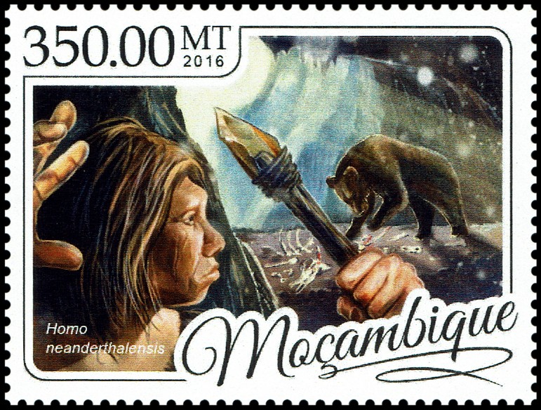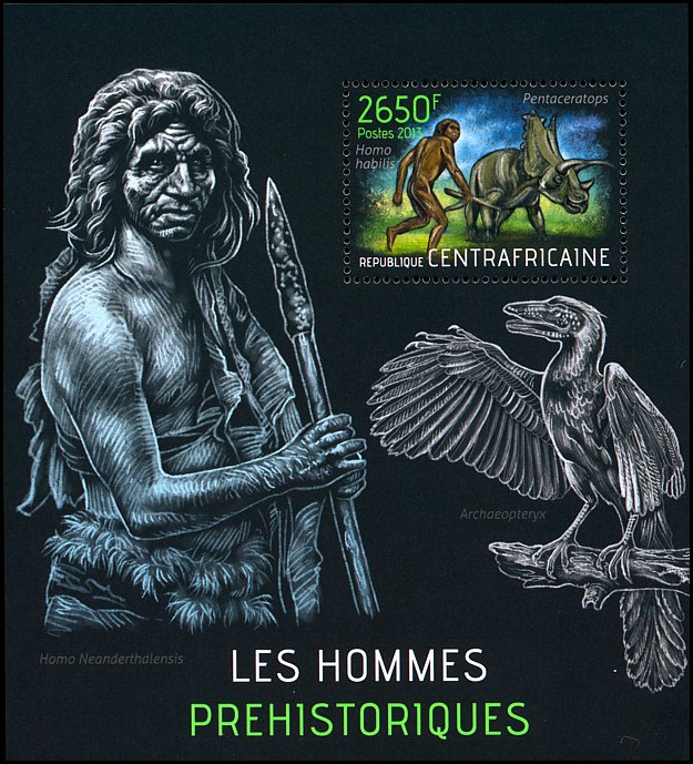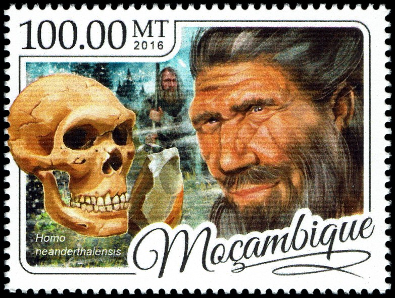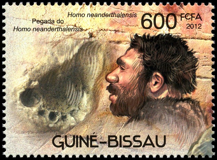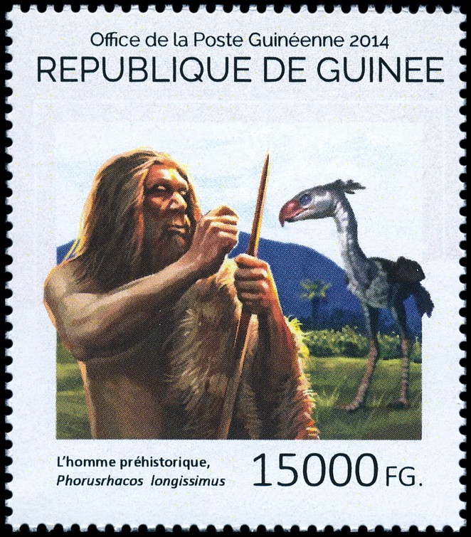 Na prawym znaczku: wizerunek neandertalczyka według dioramy w Museum of Natural History w Nowym Jorku i Phorusrhacos longissimus.