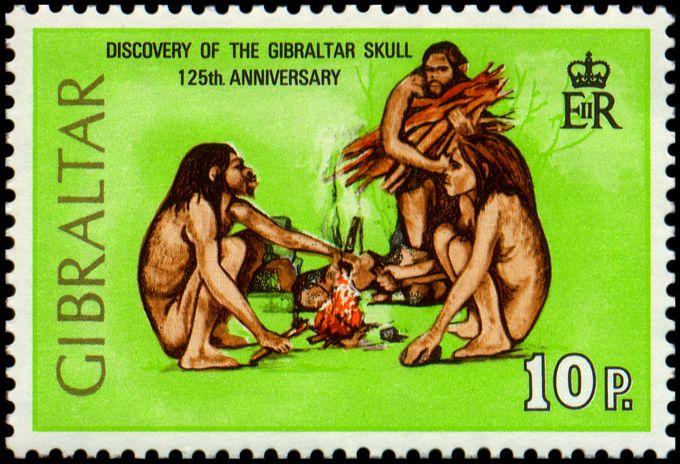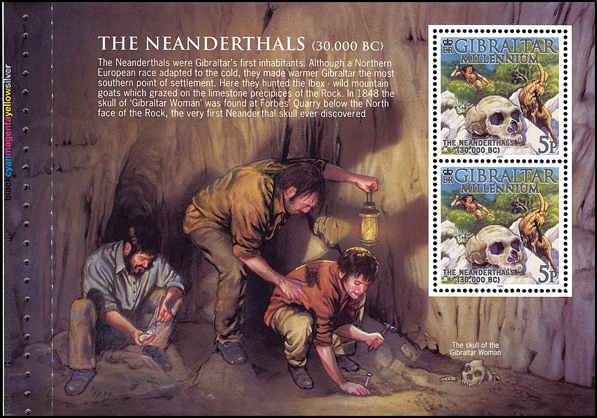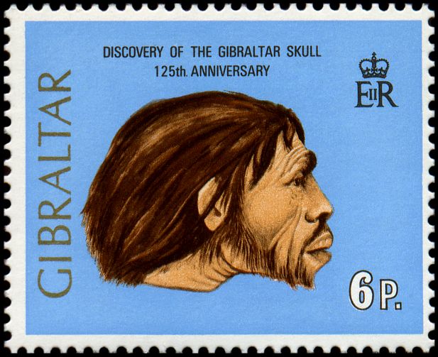 3 marca 1848 r. na posiedzeniu Towarzystwa Naukowego Gibraltaru jego sekretarz, por. Edmund Flint, zaprezentował czaszkę ludzką (Gibraltar 1) znalezioną przez robotników podczas robót w jaskini na terenie kamieniołomu Forbes’ Quarry (scenę tę przedstawia kartka z zeszyciku znaczkowego — powyżej), znajdującego się po północnej stronie Skały Gibraltaru, bezpośrednio pod stanowiskami baterii dział imienia księżnej Anny. Dokładne miejsce odkrycia nie jest jednak znane. We wrześniu 1864 r. czaszkę tę George Busk wystawił zaprezentował na spotkaniu angielskiego British Association for the Advancement of Science w Bath. Wtedy to Hugh Falcomer zaproponował, aby nazwać tę nową odmianę człowieka