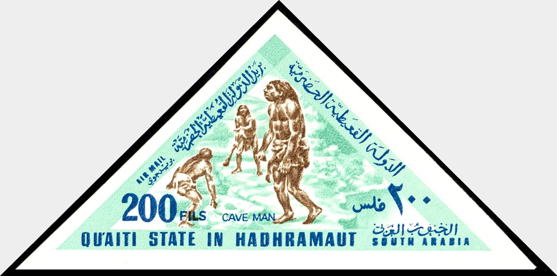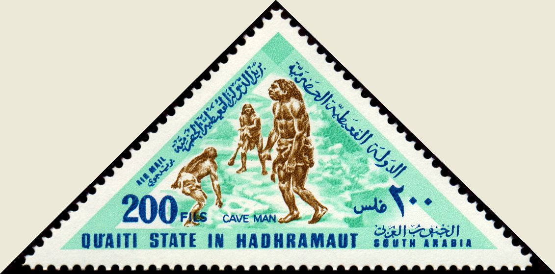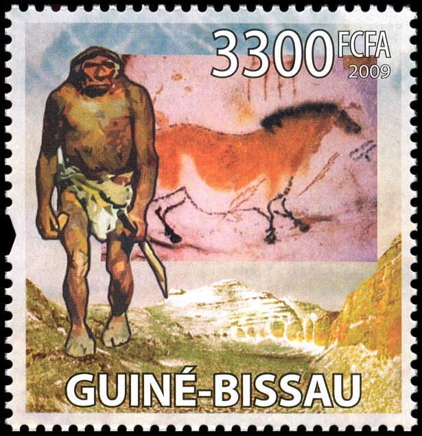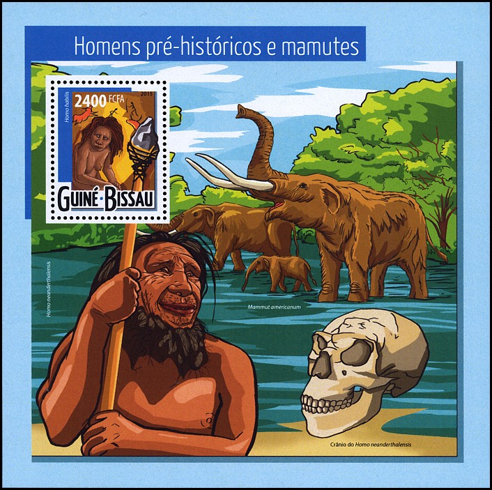 Na lewym marginesie bloku dwóch praludzi, zapewne neandertalczyków, z kamiennymi narzędziami w rękach