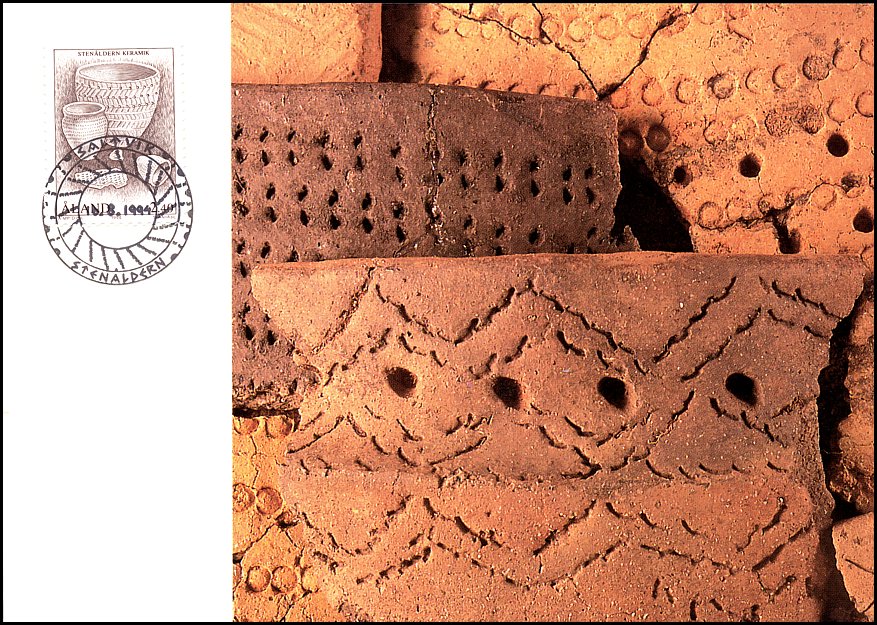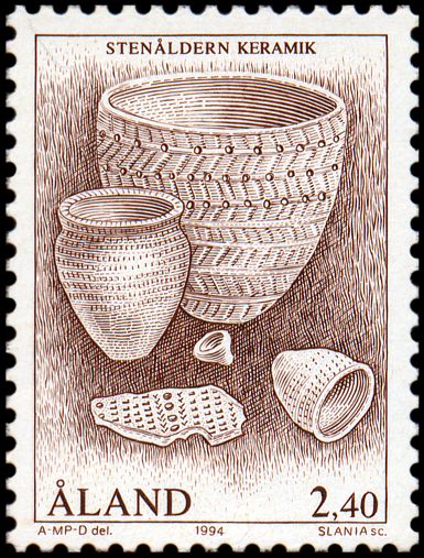 Trzy zdobione naczynia kultur ceramiki grzebykowej i dołkowej z Wysp Alandzkich oraz podobny garnek (wys. ok. 43 cm) kultury ceramiki dołkowej (ok. 3200 BC) z miejscowości Sääminki (prow. Itä-Suomen, reg. Etelä-Savo) w Finlandii.