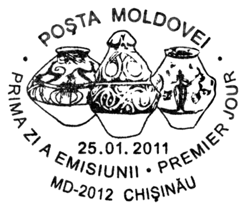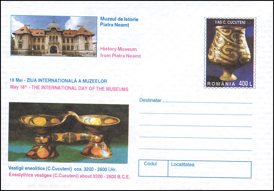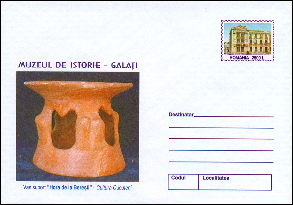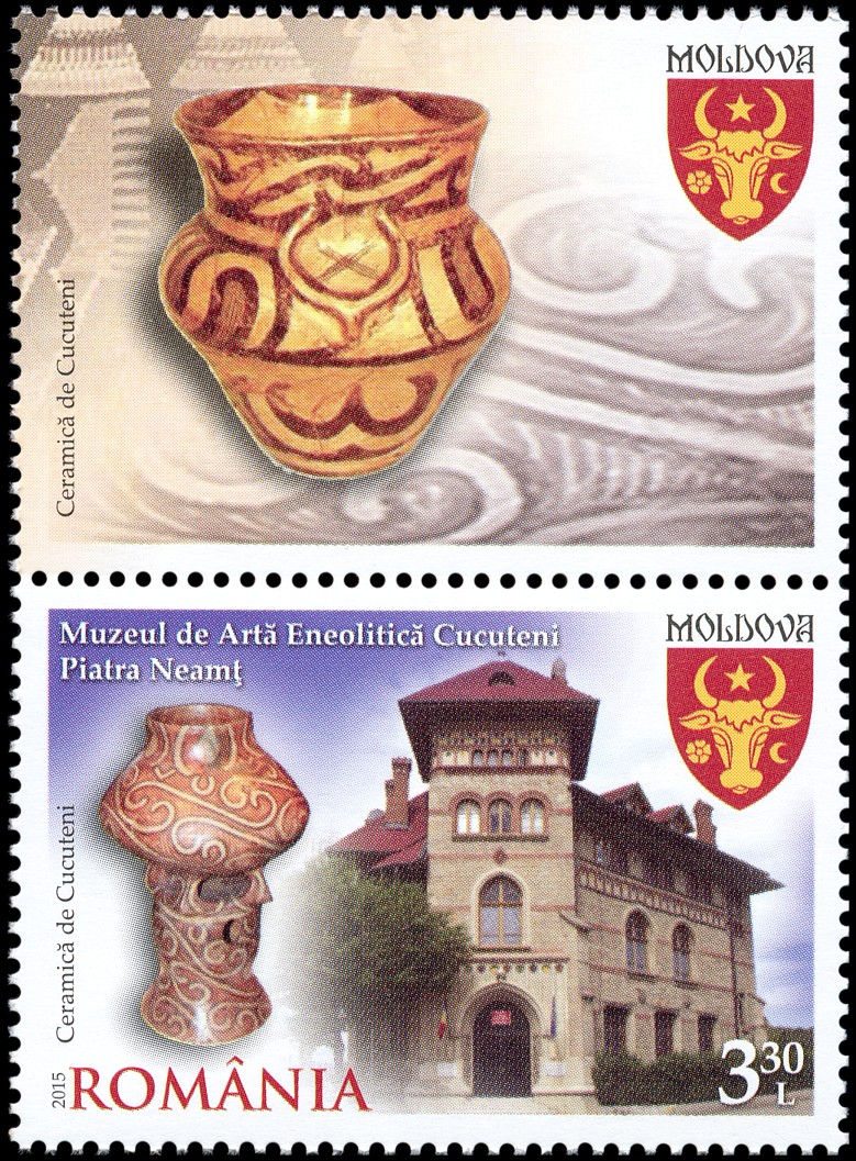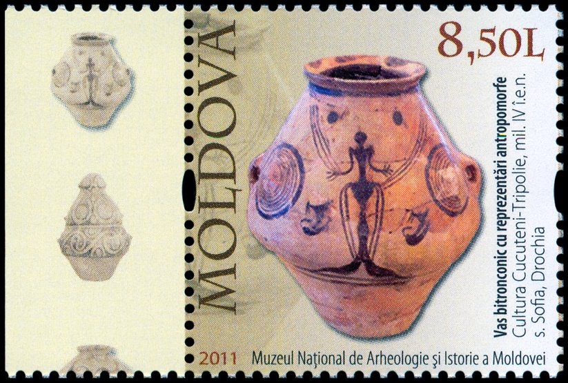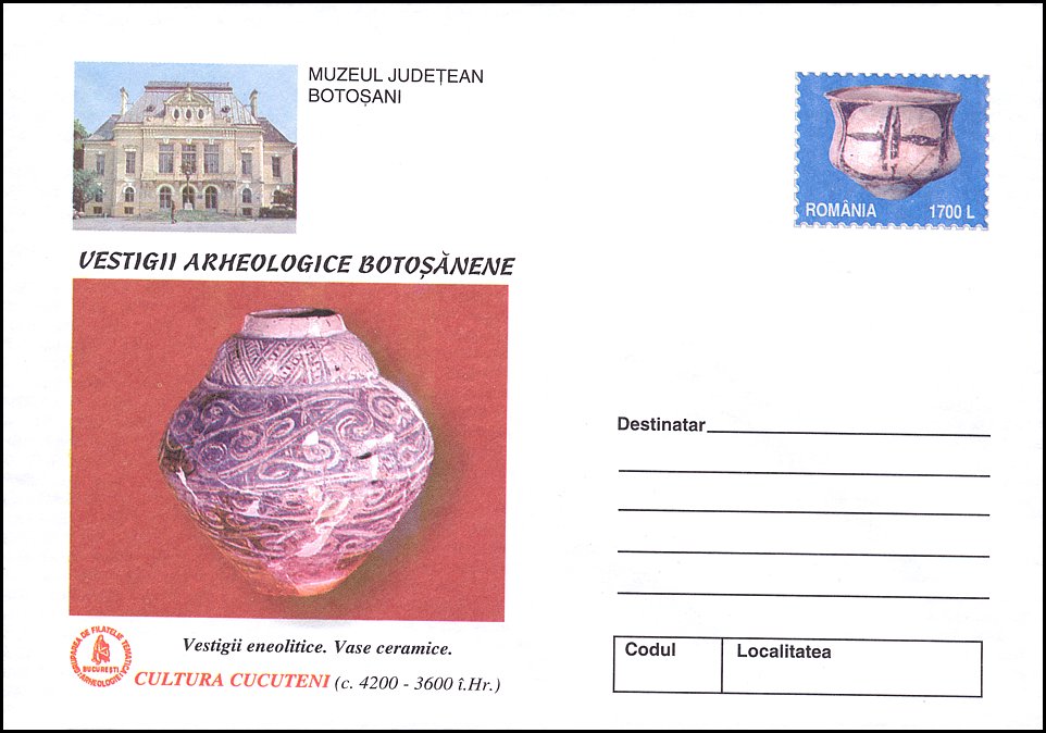 Na znaku opłaty puchar gliniany, a w części ilustracyjnej gmach Muzeul Judeţean Botoşani w Botoşani oraz amfora kultury Cucuteni-Trypole (ok. 4200–3600 BC) ze stanowiska Ostrov w Drăguşeni (gm. Drăguşeni, okr. Botoşani, Mołdawia rumuńska). Amfora składa się z dwóch wydętych członów, z dwoma niewielkimi uchami na maksymalnej wydętości brzuśca i na szyi. Dekoracja malarska podzielona jest na trzy rejestry: na szyi znajdują się zaplatane trójkąty wypełnione ukośną kratką, górną część brzuśca pokrywają spirale i spiralne menadry, a dolną prostokątne meandry. Niezdobione pozostały tylko krótka stożkowata szyjka i przydenna część brzuśca.