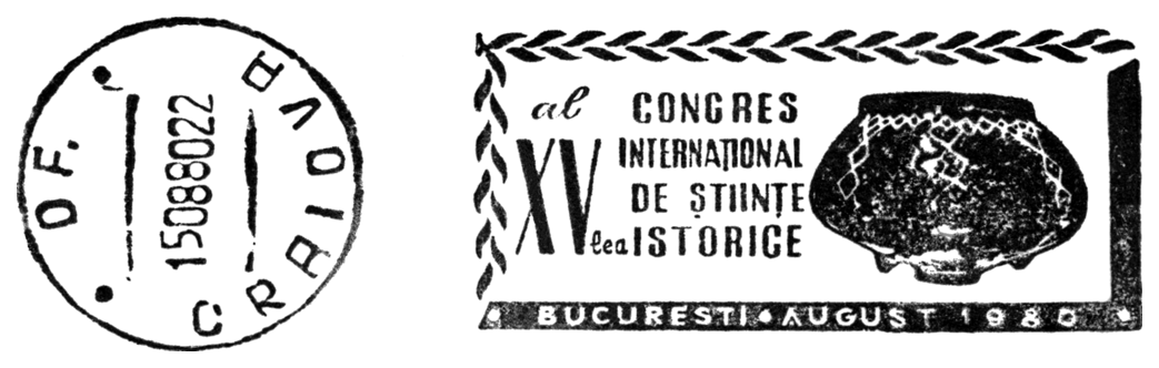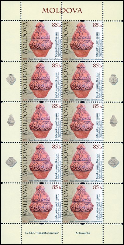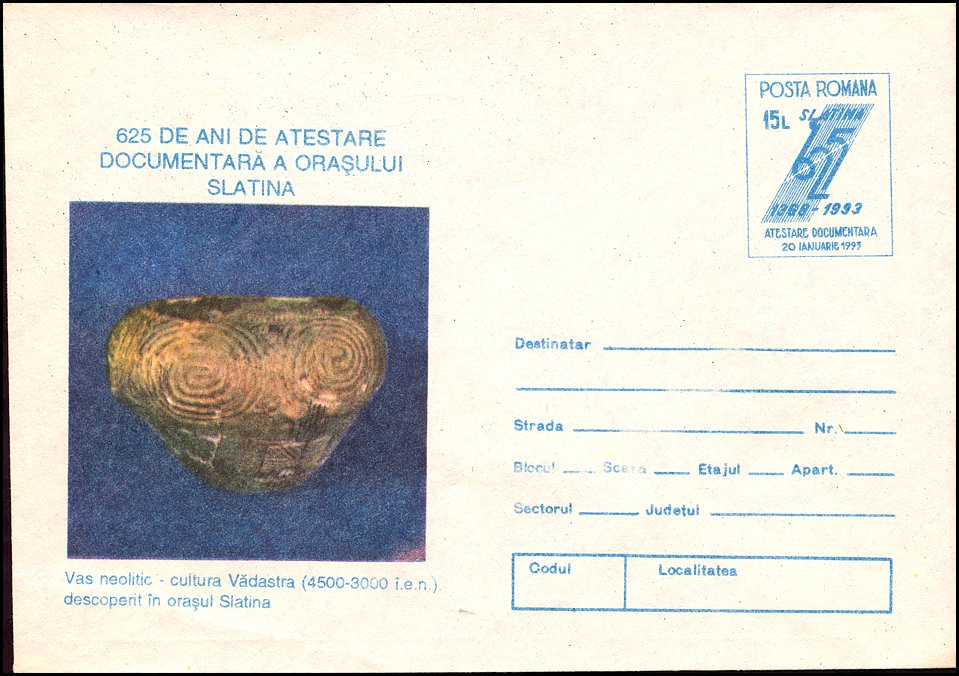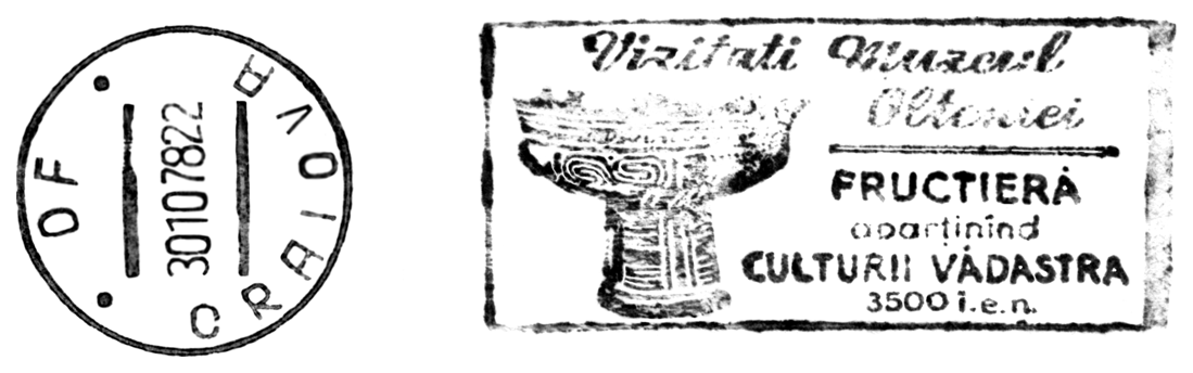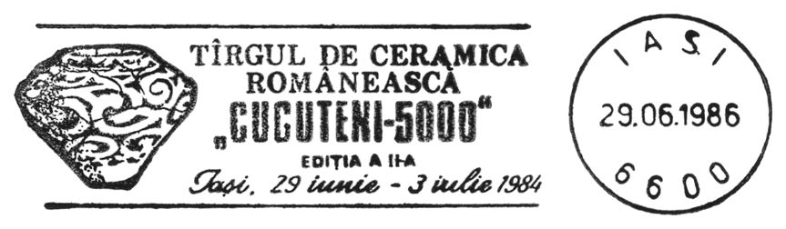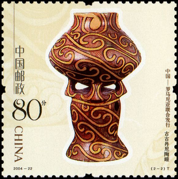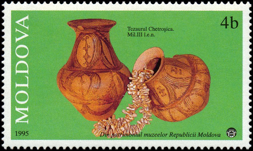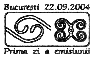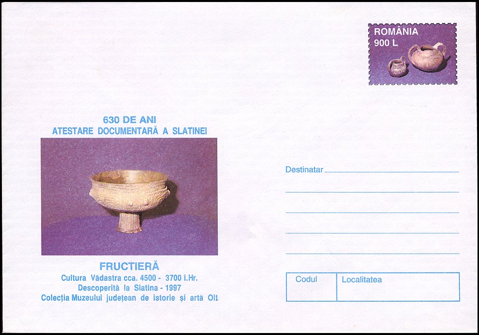 Na znaku opłaty puchar gliniany, a w części ilustracyjnej gmach Muzeul Judeţean Botoşani w Botoşani oraz amfora kultury Cucuteni-Trypole (ok. 4200–3600 BC) ze stanowiska Ostrov w Drăguşeni (gm. Drăguşeni, okr. Botoşani, Mołdawia rumuńska). Amfora składa się z dwóch wydętych członów, z dwoma niewielkimi uchami na maksymalnej wydętości brzuśca i na szyi. Dekoracja malarska podzielona jest na trzy rejestry: na szyi znajdują się zaplatane trójkąty wypełnione ukośną kratką, górną część brzuśca pokrywają spirale i spiralne menadry, a dolną prostokątne meandry. Niezdobione pozostały tylko krótka stożkowata szyjka i przydenna część brzuśca.