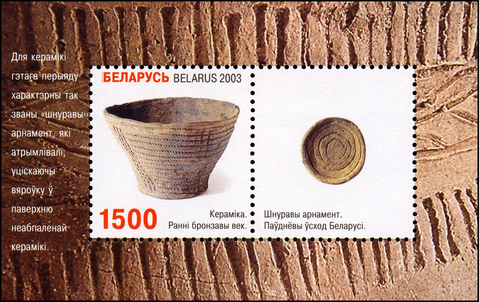 Na dolnym marginesie bloku, w środku, dwa neolityczne naczynia gliniane: