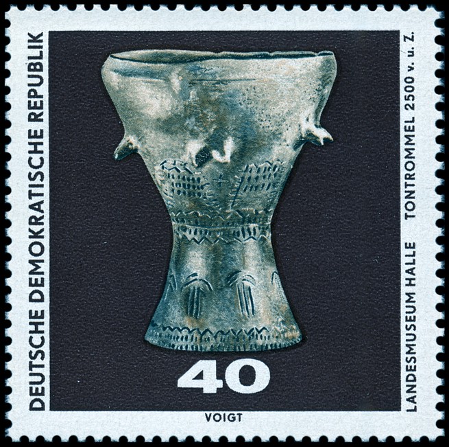 Bęben gliniany (wys. ok. 23 cm) ludności grupy Salzmünde kultury pucharów lejkowatych (ok. 3000 BC) pochodzący z miejscowości Leuna-Rössen koło Merseburga (Saalekreis, Saksonia-Anhalt).