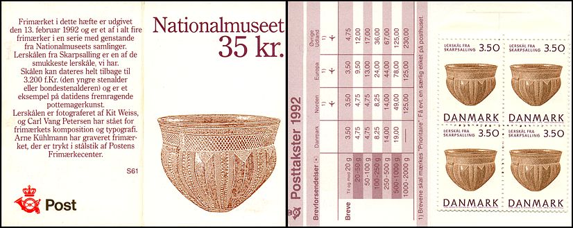 Zeszycik znaczkowy zawiera 10 sztuk tych znaczków. Autorem tego udanego projektu był Carl Vang Petersen, a ryt wykonał Arne Kühlmann.