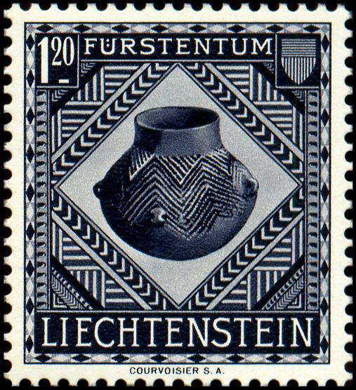 Czteroucha amfora ludności kultury Rössen o kulistym brzuścu bogato zdobionym ornamentem wykonanym w technice ściegu bruzdowego (połączenie rycia i odciskania), pochodząca z Gutenberg, gm. Balzers, uznawana za najstarsze (ok. 4700 BC) naczynie ceramiczne na terenie Lichtensteinu.
