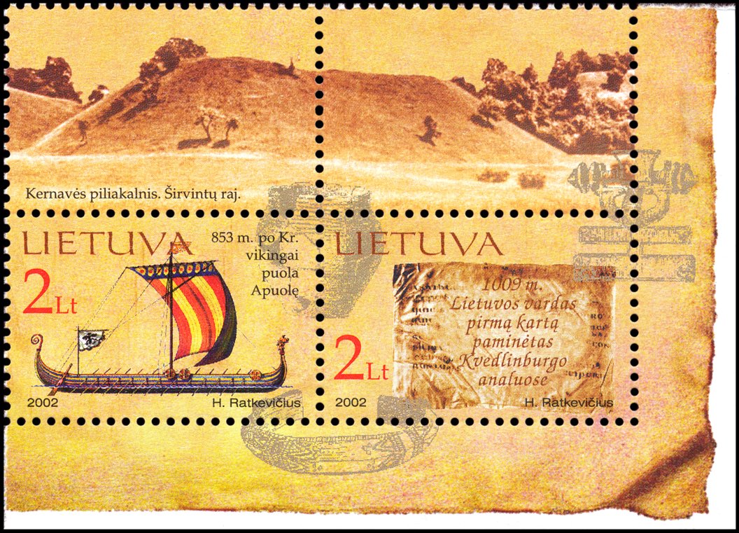 Pierwszoplanowa treść tych dwóch znaczków (z przywieszkami) odnosi się do początków średniowiecznych dziejów Litwy, ale w ich tle pokazano szereg zabytków archeologicznych z wcześniejszych epok, m.in. w samym środku znajduje się naczynie (lepiej widać to na