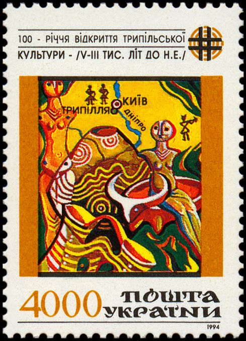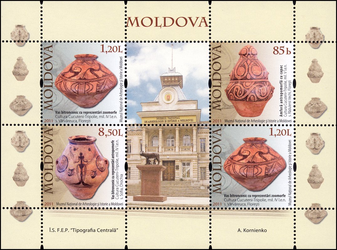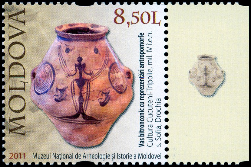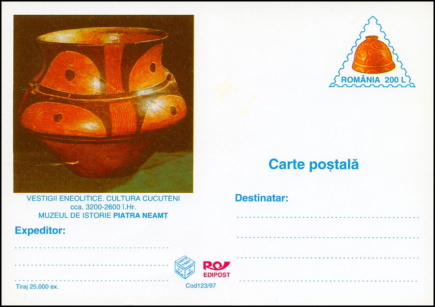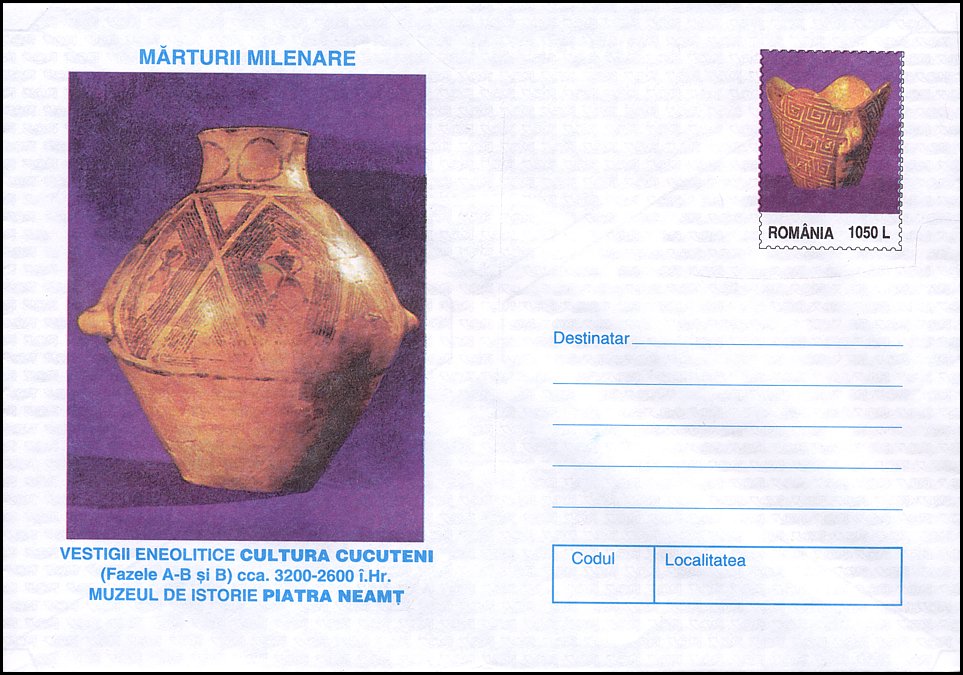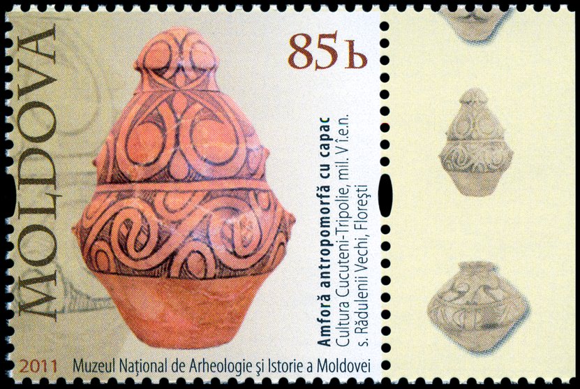 Na znaku opłaty tej kartki pocztowej pokazano pokrywkę naczynia kultury Cucuteni-Trypole (zapewne z fazy A