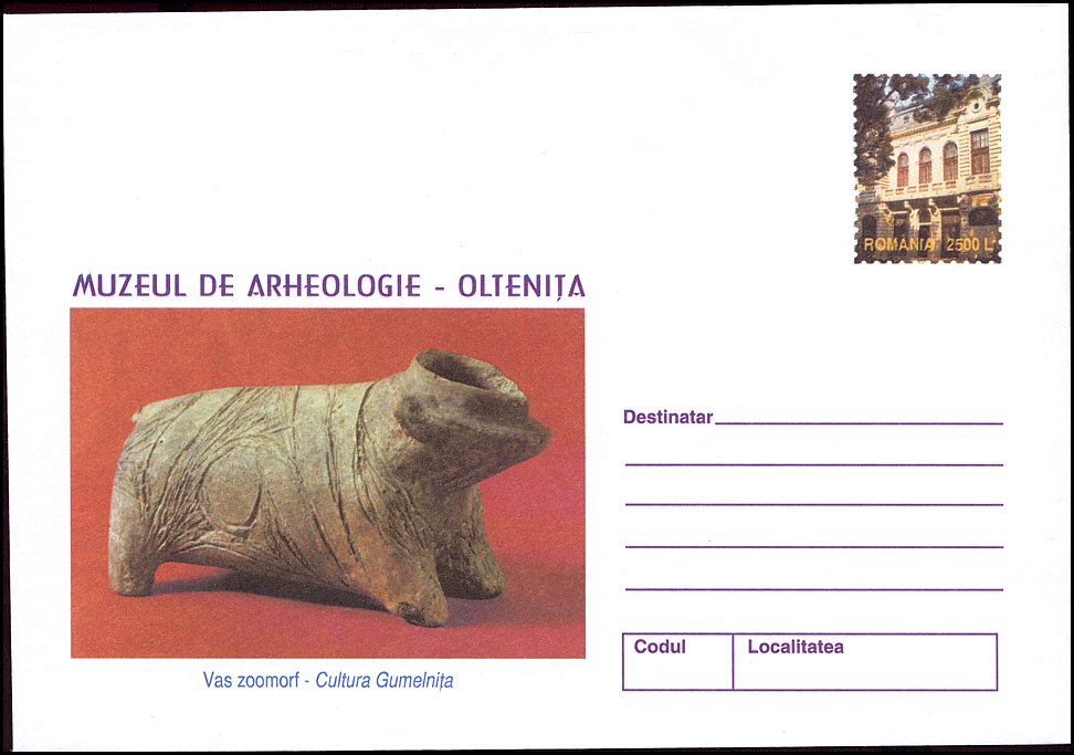 W części ilustracyjnej naczynie gliniane o dwóch szyjkach kultury Gumelniţa (ok. 4300–4100 BC) ze stanowiska Măgura Gumelniţa w Olteniţa (okr. Călăraşi, Wołoszczyzna), a powyżej widok Muzeul Naţional de Istorie a României w Bukareszcie.