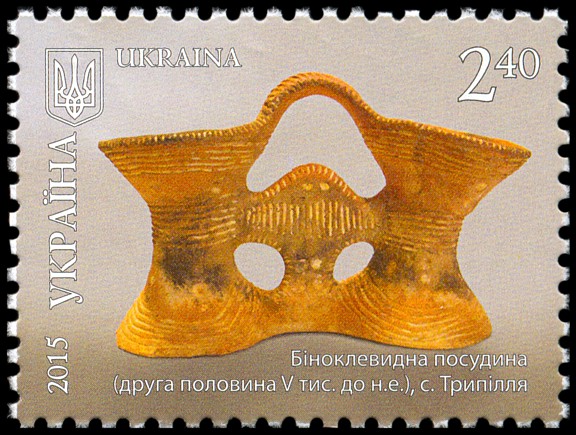 Na znaku opłaty pokazano zdobione malowaniem dwuche naczynie o kwadratowym wylewie (wys. 16 cm, średn. 18,5 cm) kultury Cucuteni-Trypole (faza A–B