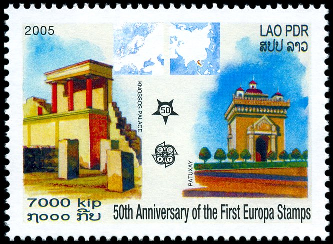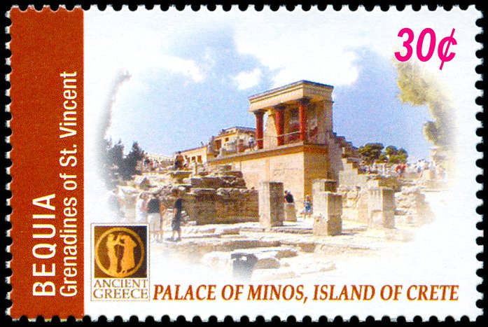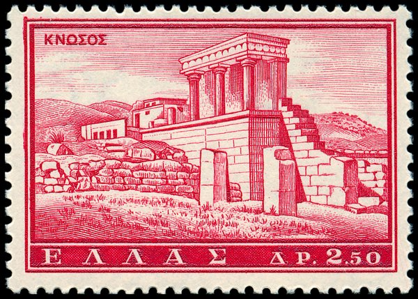 Tzw. pałac Minosa (widok ogólny ruin i częściowo zrekonstruowane wejście północne) w Knossos (nomos Heraklion, reg. Kreta)? Istniejący ok. 2000–1400 p.n.e. pałac był wielokrotnie przebudowywany i odbudowywany (głównie ok. 1700, 1600 i 1450 p.n.e.) i zajmował obszar ok. 180×130 m. Do czasów dzisiejszych zachowały się przede wszystkim piwnice i pomieszczenia parterowe, odkopane przez Arthura Evansa w latach 1899–1905.