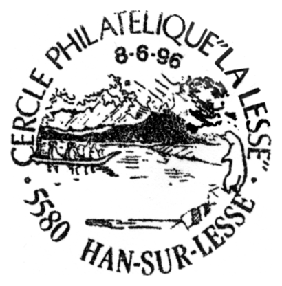 Na datowniku i znaczku ten sam motyw — widok rzeki Lesse wypływającej z
