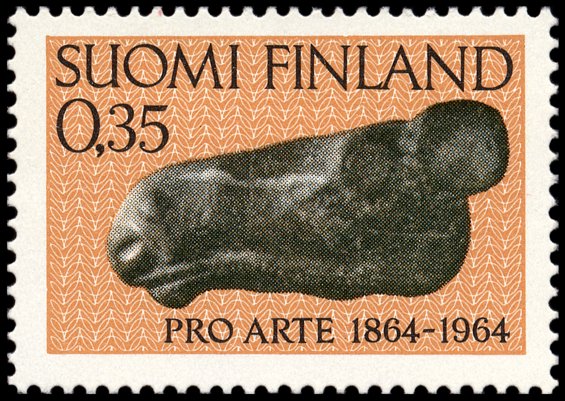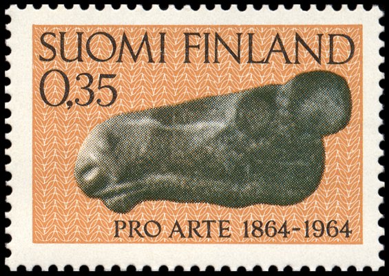 Znaleziona przypadkowo w 1903 r. w Palojoki koło Huittinen (prow. Länsi-Suomen, reg. Varsinais-Suomi) rzeźba głowy łosia (ok. 7000–6000 BC) ze steatytu, uważana za dzieło ludności mezolitycznej kultury Suomusjärvi. Posiada ona otwór do osadzenia styliska (niewidoczny na znaczku), pełniła więc zapewne funkcję odznaki władzy (jak berło) lub głowicy broni (w rodzaju maczugi lub młota).
