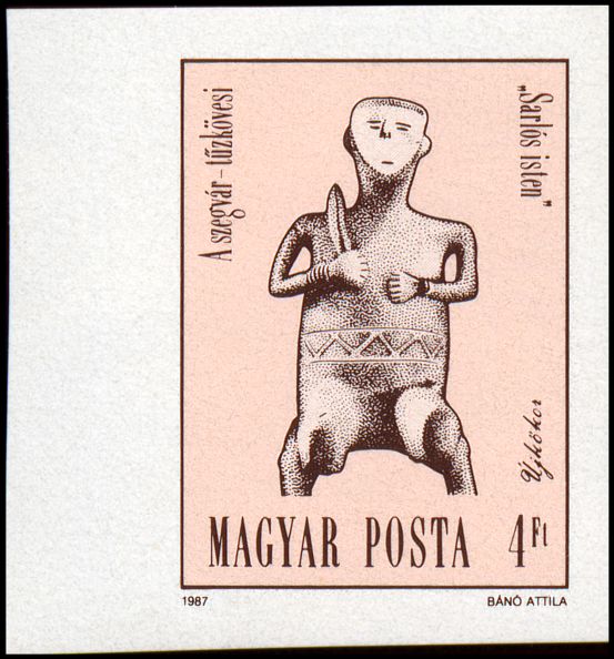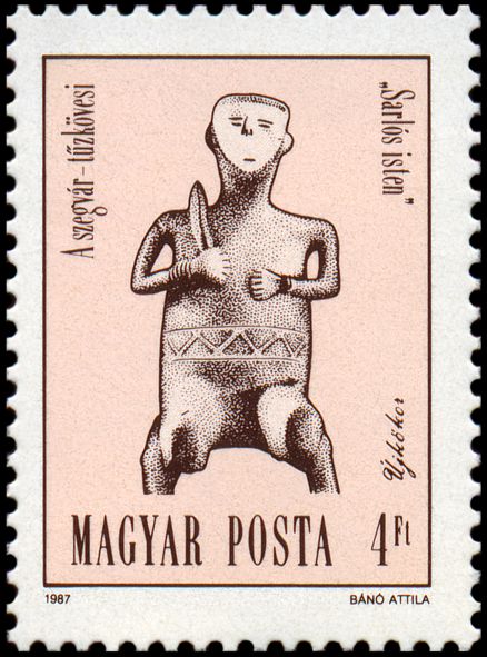 Gliniana figurka (25,6 cm wys.) siedzącego na krześle/tronie mężczyzny, tzw. „boga z sierpem” (faza klasyczna kultury nadcisańskiej, synchroniczna z fazą C kultury Vinča, ok. 5100–4500 BC), z tellu kultury nadcisańskiej w Szegvár-Tűzköves (pow. Szentes, kom. Csongrád). Nogi mężczyzny są odłamane poniżej kolan. Obie jego ręce zdobią bransolety, a w pasie przepasany jest szarfą albo pasem, przedstawionym jako wstęga wypełniona zygzakiem. W prawej ręce trzyma zakrzywiony miecz lub sierp, który opiera na prawym ramieniu. Twarz figurki, z zaznaczonymi oczami, nosem, ustami i uszami, jest płaska i trójkątna. Może to być wynikiem specyficznej stylizacji lub wyobrażeniem maski noszonej przez tego mężczyznę (kapłana?).