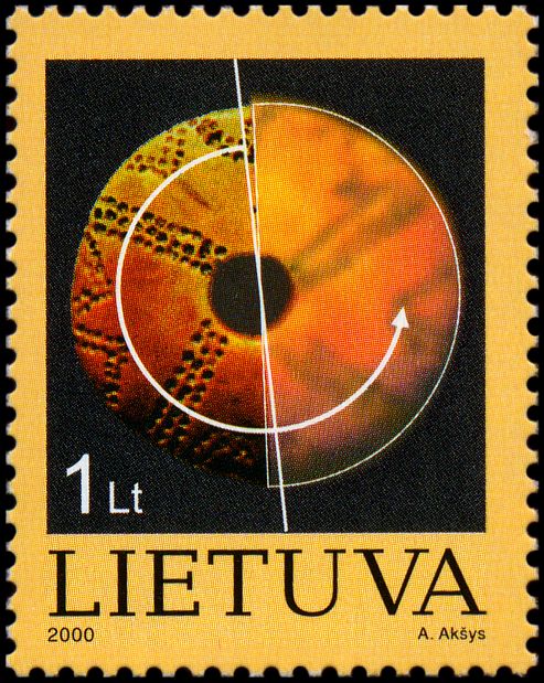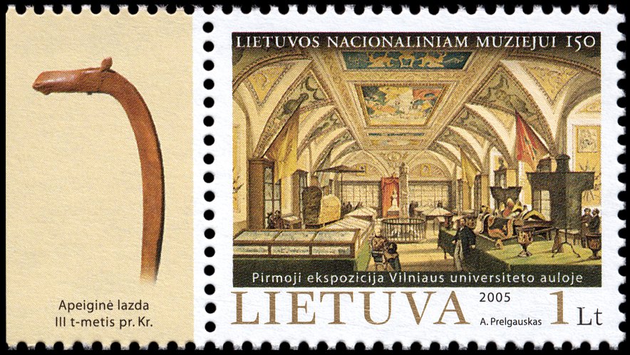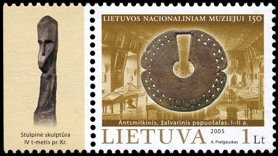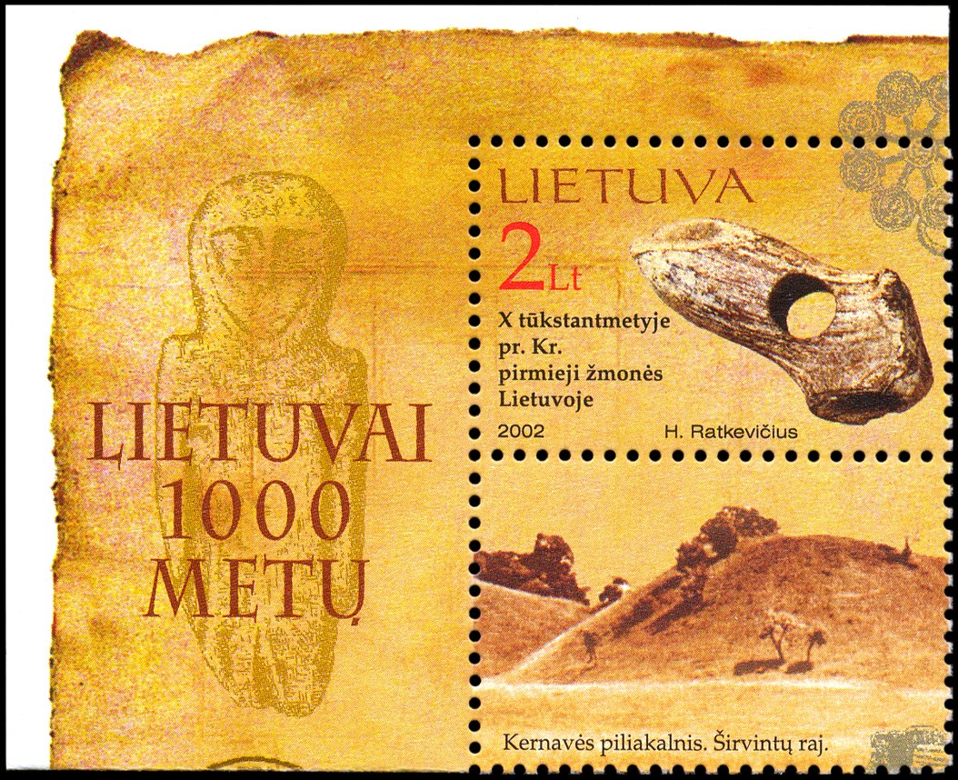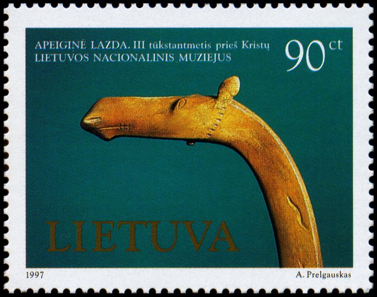 Figurka ta została pokazana (1) na marginesie bloku wydanego dla uświetnienia 1000. rocznicy powstania Litwy, (2) na lewym marginesie arkusza znaczków poświęconych Muzeum Bursztynu w Połądze oraz (3) w tle znaczka upamiętniającego litewskiego archeologa