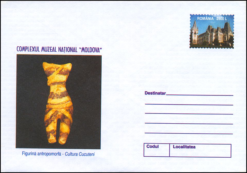 Zdobiona malowaniem typowa figurka (wys. 13 cm, szer. 4,5 cm) męska (z elementami ubioru w postaci dwóch pasów: poziomego na biodrach i ukośnego na ramieniu) kultury Cucuteni-Trypole (faza A, ok. 4500–3900 BC) ze stanowiska Dealul Bodeşti / La Nuci w Scânteia (gm. Scânteia, okr. Iaşi, Mołdawia rumuńska).