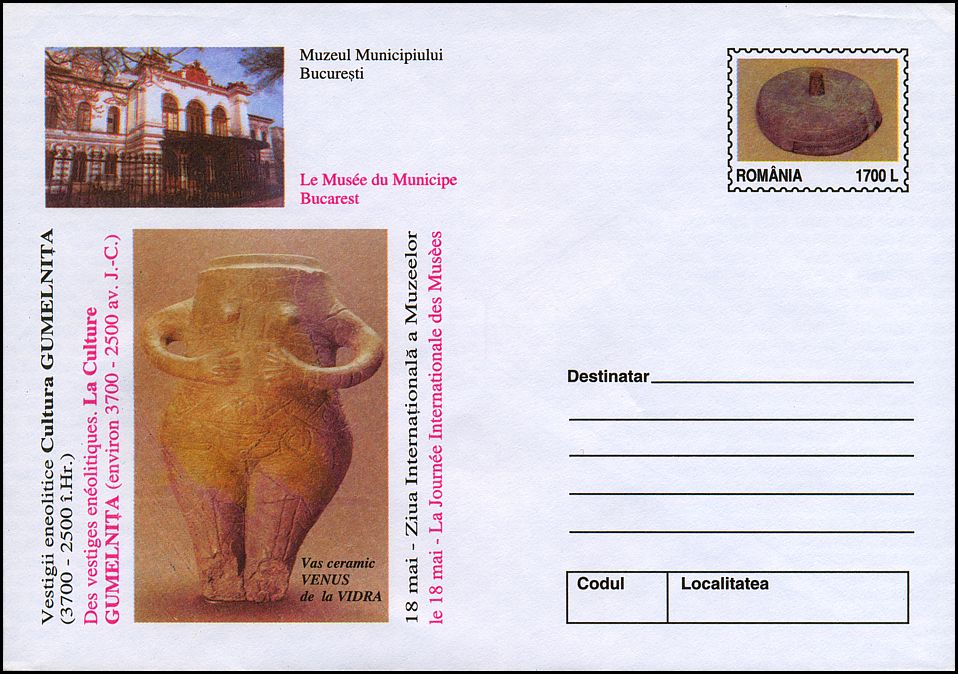 Pokrywka gliniana oraz zdobione ryciem i malowaniem naczynie gliniane (wys. 42,5 cm, średn. 26,0 cm) w kształcie tułowia kobiety, tzw. Wenus z Vidra, z warstwy IIC ze stanowiska Tell-ul Vidra (okr. Ilfov, Wołoszczyzna) kultury Gumelniţa (faza A