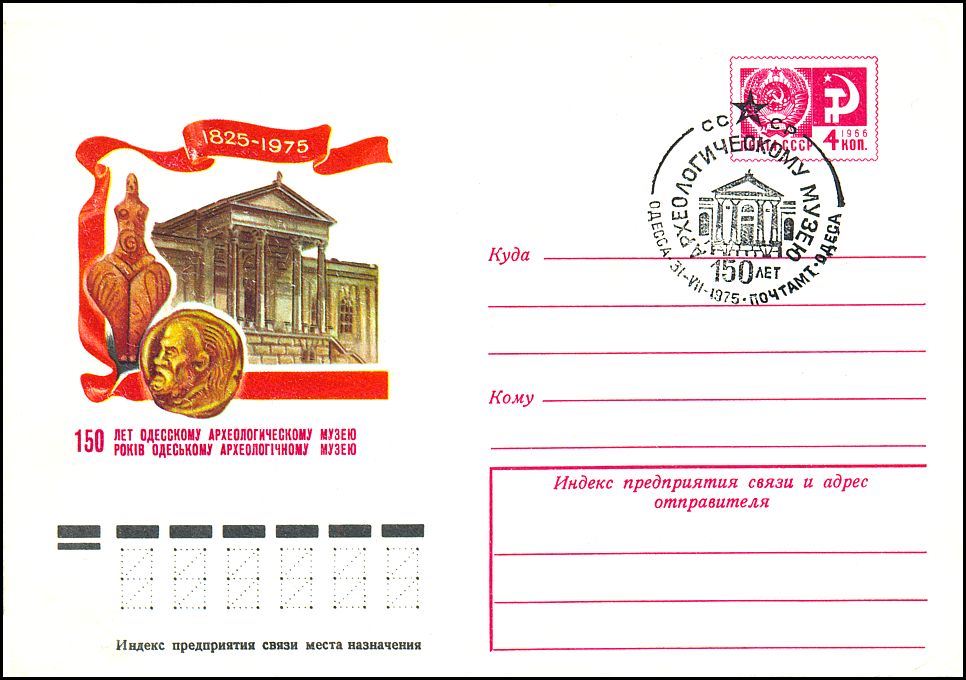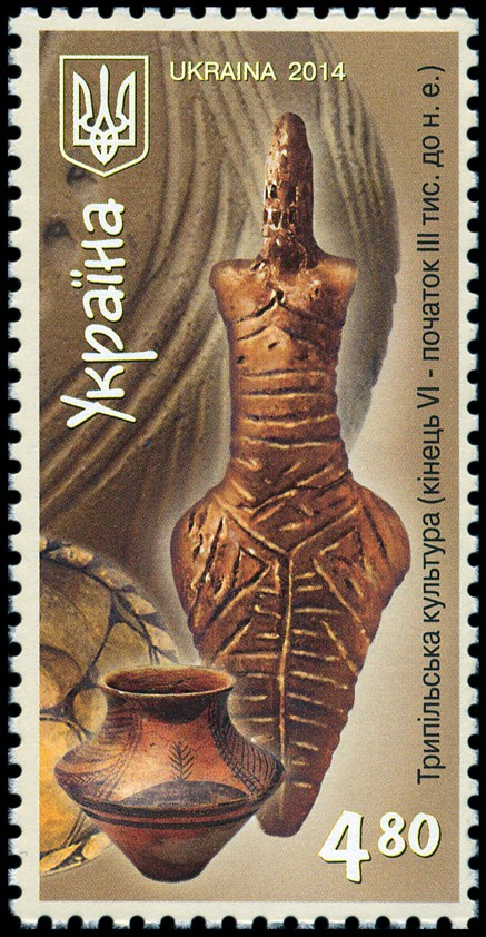 Kobieca figurka pokryta ornamentem rytym z wczesnej fazy kultury trypolskiej (Trypole A, pierwsza połowa V tys. BC), na której brzuchu znajduje się stylizowany wizerunek amuletu w postaci zwiniętego węża, a także złota moneta z wizerunkiem brodatego mężczyzny — na tle budynku Muzeum Archeologicznego w Odessie.