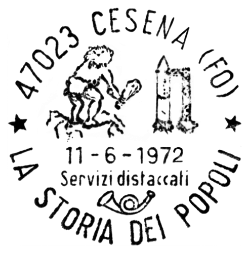 Na drugiej stronie okładki zeszyciku znaczkowego dwóch jaskiniowców — jeden jadący na dinozaurze (!), a drugi z maczugą w ręce.