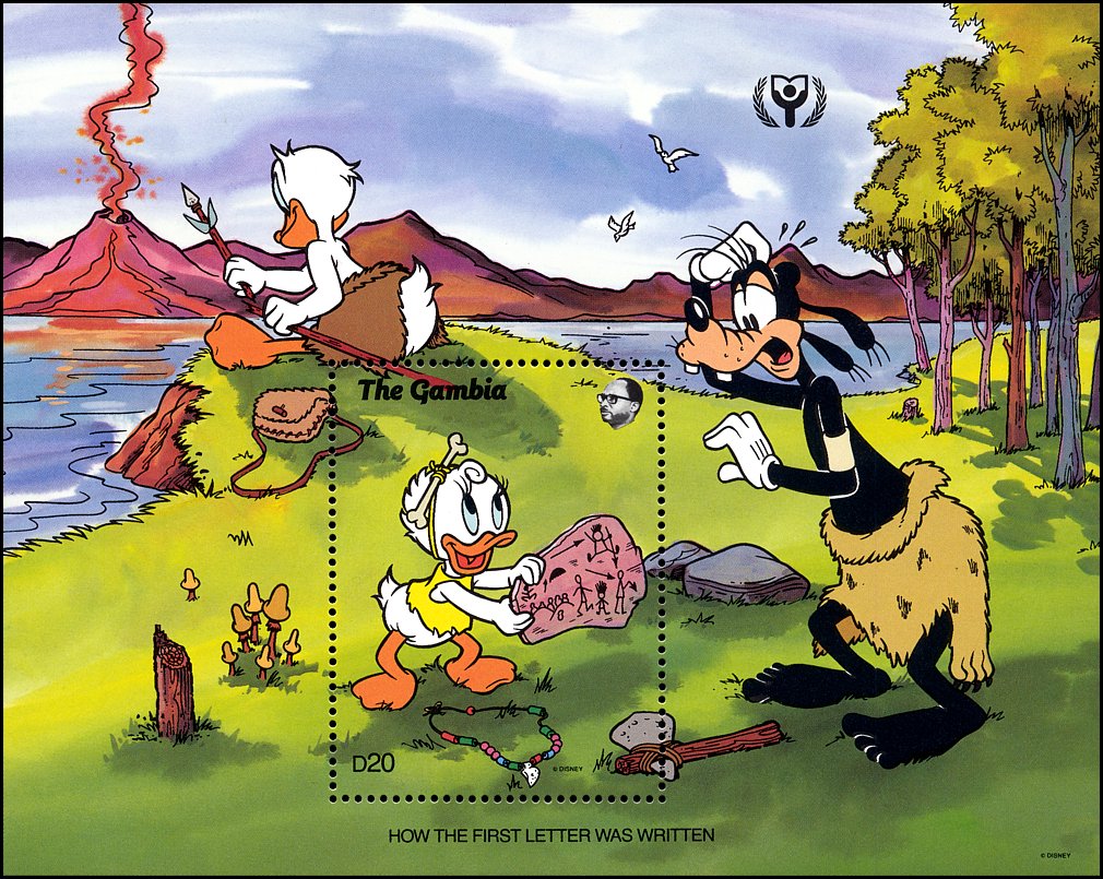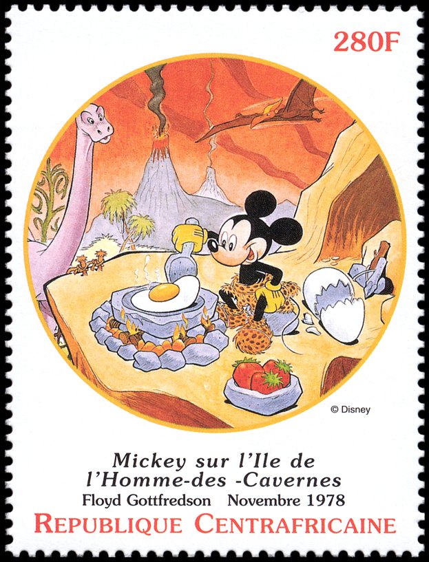 Myszka Miki jako jaskiniowiec smażący jajo dinozaura — rysunek Floyda Gottfredsona (1905–1986) z 1978 roku.