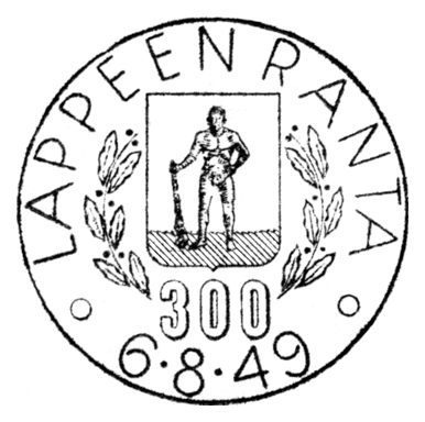 Herb miasta Lappeenranta (reg. Etelä-Karjala, tj. Karelia Południowa) z wyobrażeniem „dzikiego człowieka” wspartego na maczudze, ubranego tylko w wieńce z liści na głowie i biodrach.