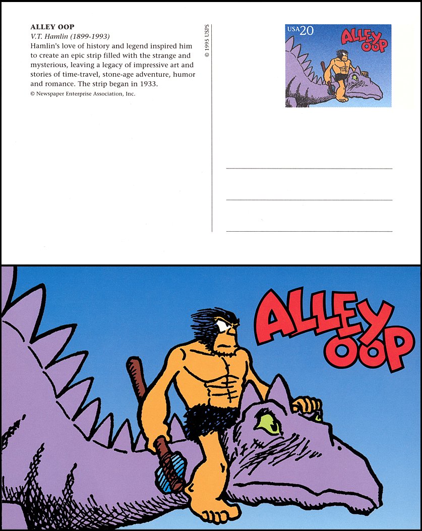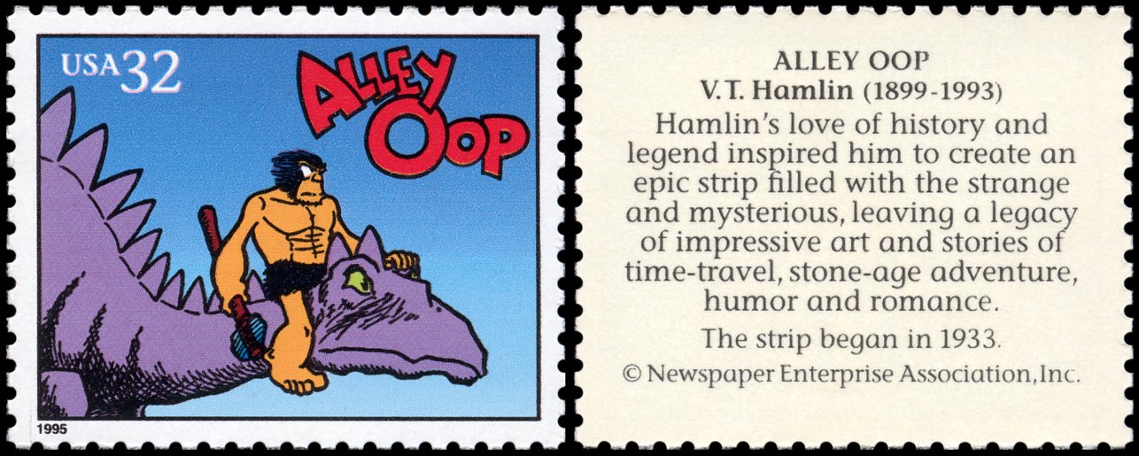 Alley Oop — komiksowe wyobrażenie praczłowieka (jaskiniowca) jadącego na dinozaurze (!).