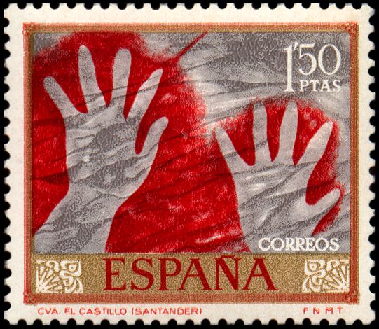 Negatywy dłoni, zwane także sylwetkami rąk - czerwone malowidło z jaskini Cueva El Castillo.
