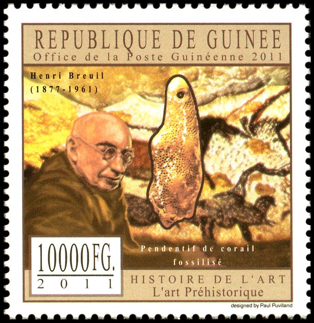 Na znaczku Gwinei także jeden z największych badaczy sztuki paleolitycznej — abbé Breuil, czyli